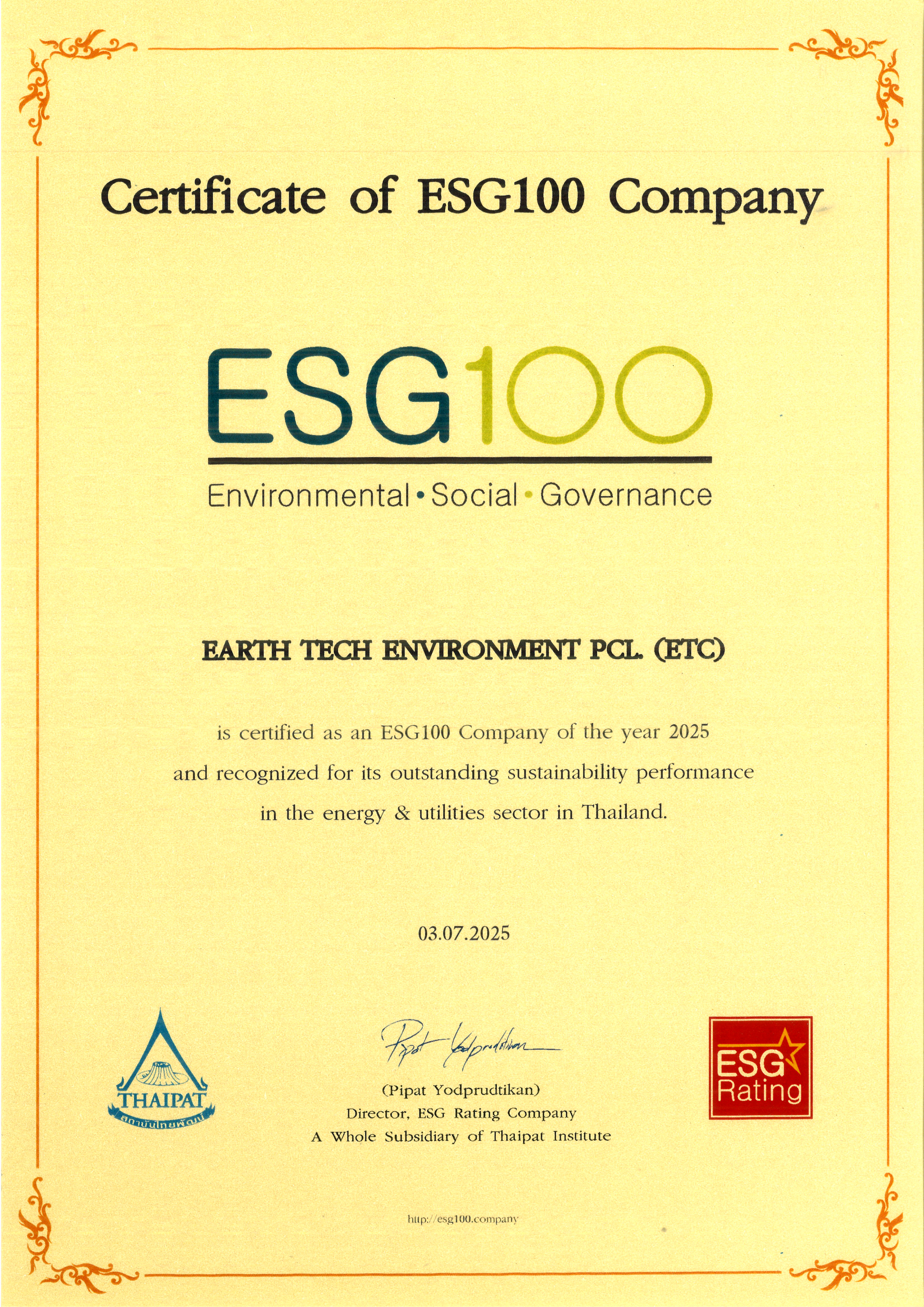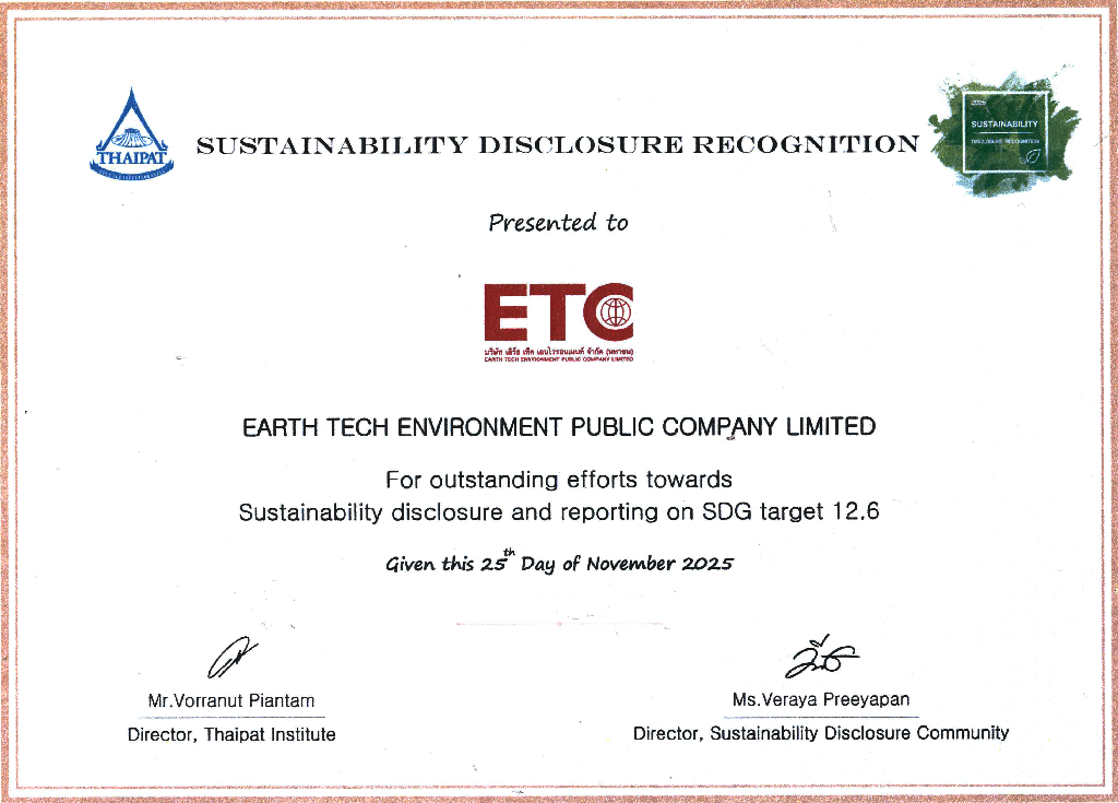 “ETC” ติดอันดับหุ้น ESG100 ต่อเนื่องเป็นปีที่ 5 ESG Rating สถาบันไทยพัฒน์ ประกาศให้ ETC ติดอันดับ ESG100 ประจำปี 2568ด้วยการคัดเลือกจาก 920 หลักทรัพย์จดทะเบียน ให้เป็นบริษัทที่มีการดำเนินงานโดดเด่นด้านสิ่งแวดล้อม สังคม และ ธรรมาภิบาล