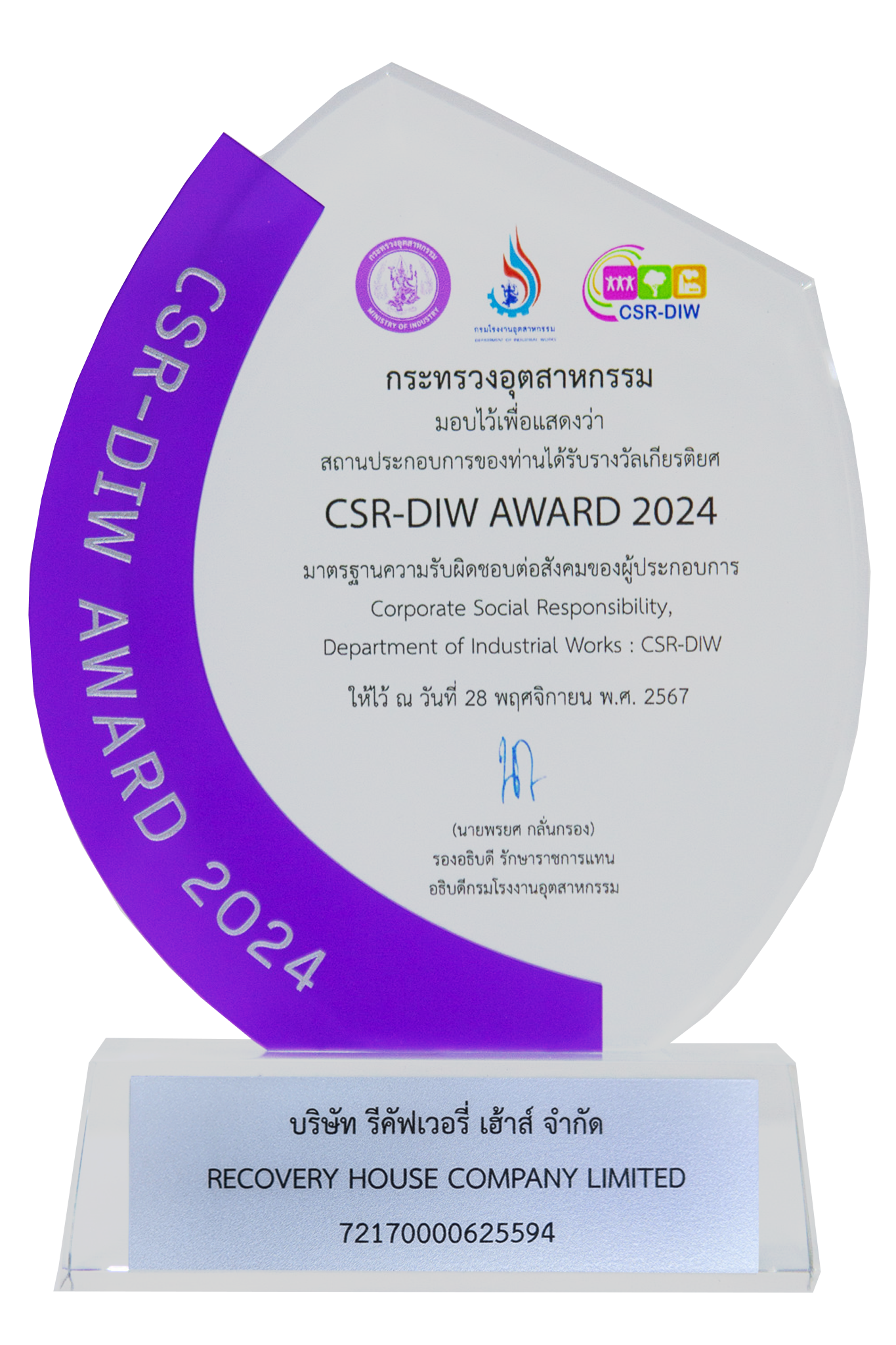รางวัลธรรมาภิบาลสิ่งแวดล้อมและความปลอดภัย (ธงขาว-ดาวเขียว) ประจำปี 2567 ระดับดีเยี่ยม บริษัท รีคัฟเวอรี่เฮ้าส์ จำกัด