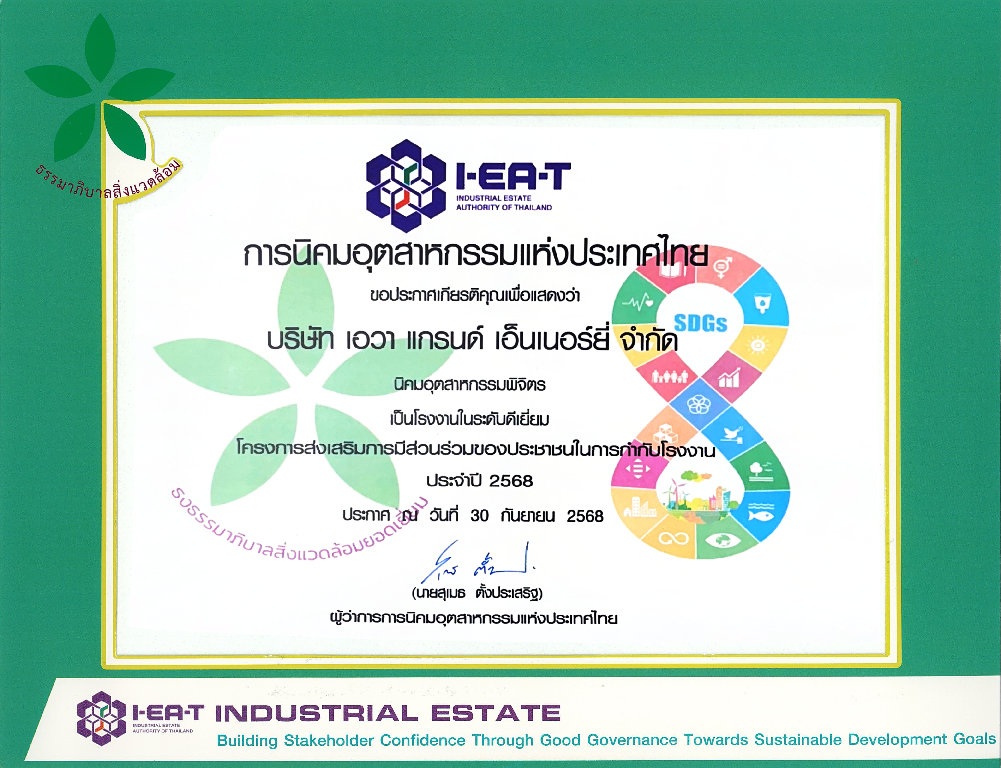 กลุ่มโรงไฟฟ้า บริษัท เอิร์ธ เท็ค เอนไวรอนเม้นท์ จำกัด (มหาชน), บริษัท เอวาแกรนด์ เอ็นเนอร์ยี่ จำกัด ได้รับการเกียรติบัตร “โรงงานเครือข่ายเพื่อความยั่งยืน 2568 ”  จากการนิคมอุตสาหกรรมแห่งประเทศไทย