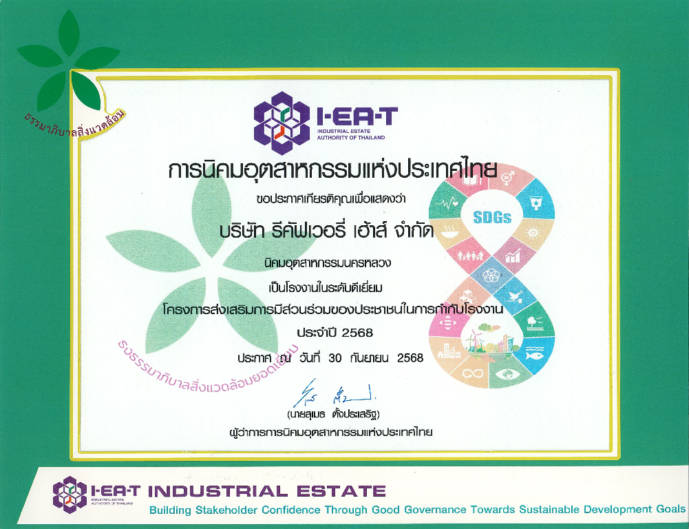 บริษัท รีคัฟเวอรี่ เฮ้าส์ จำกัด    ได้รับธรรมาภิบาลสิ่งแวดล้อมยอดเยี่ยม