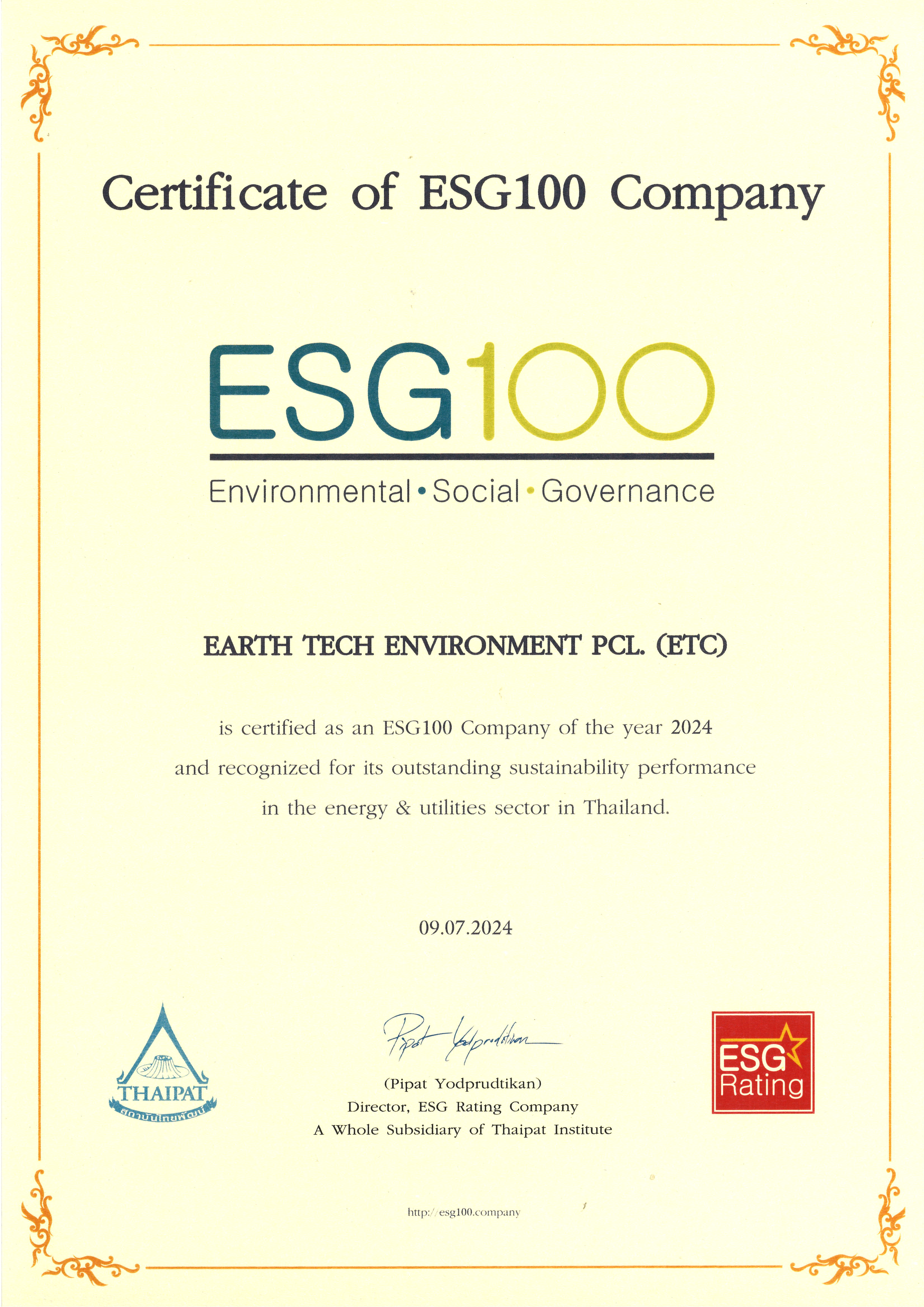 “ETC” ติดอันดับหุ้น ESG100 ต่อเนื่องเป็นปีที่ 4 นายศุภวัฒน์ คุณวรวินิจ รักษาการกรรมการผู้จัดการ บริษัท เอิร์ธ เท็ค เอนไวรอนเมนท์ จำกัด (มหาชน) เปิดเผยว่า ตามที่หน่วยงาน ESG Rating สถาบันไทยพัฒน์ ประกาศให้ ETC ติดอันดับ ESG100 ประจำปี 2567 ด้วยการคัดเลือกจาก 920 หลักทรัพย์จดทะเบียน ให้เป็นบริษัทที่มีการดำเนินงานโดดเด่นด้านสิ่งแวดล้อม สังคม และ ธรรมาภิบาล (Environmental Social and Governance : ESG) ในกลุ่มทรัพยากร ถือเป็นอีกหนึ่งความภาคภูมิใจของบริษัท ที่เข้าอยู่ในทำเนียบ ESG100 ต่อเนื่องเป็นปีที่ 4